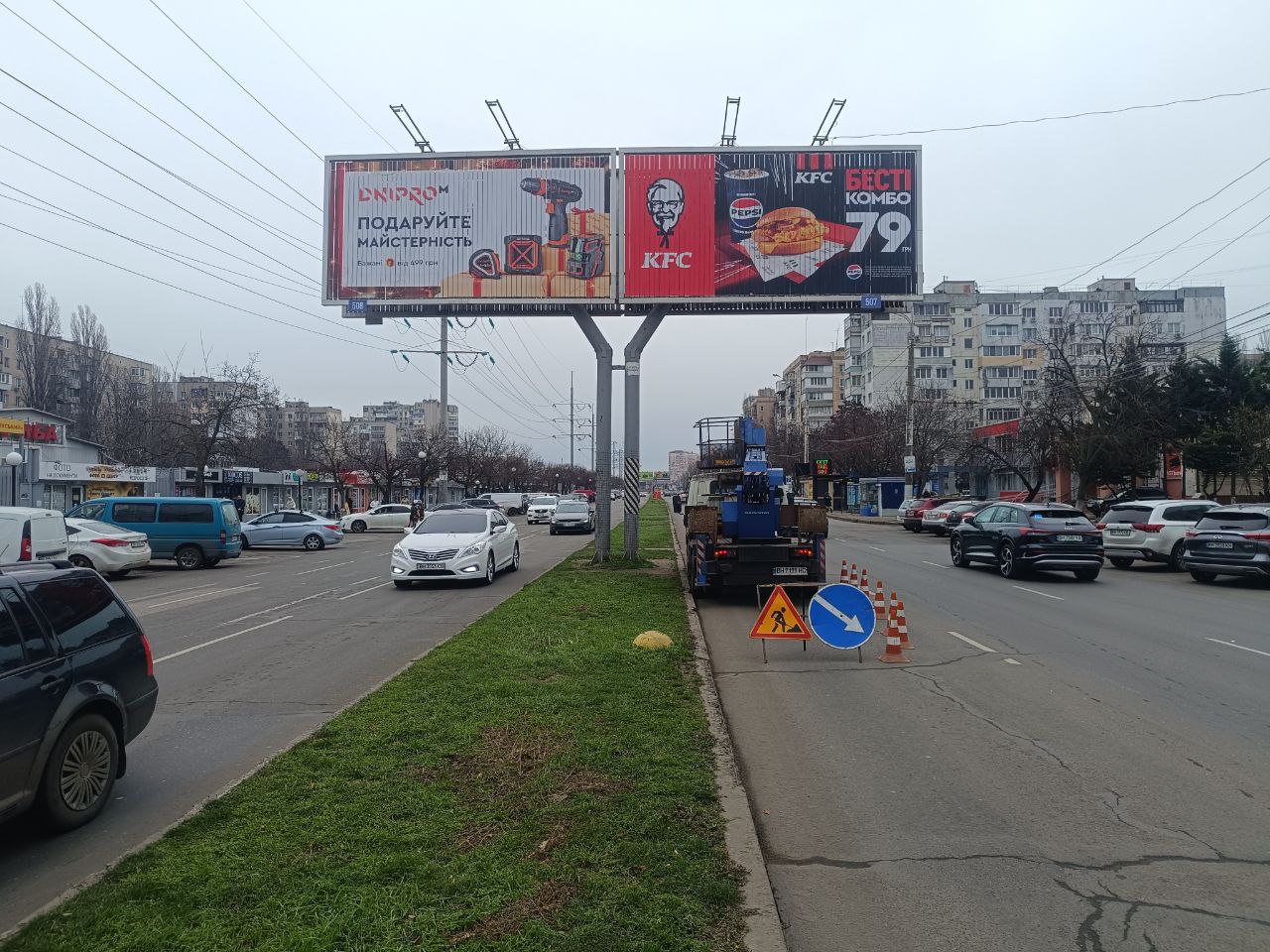 This Prismatron is located in the Kyivskyi district of Odesa, on the bustling Kniazia Yaroslava Mudroho Avenue, near the "Zoloty Dyk" interchange. This is an intense transport artery, ensuring a significant flow of vehicles and pedestrians. Nearby are large commercial objects such as the "Panorama" shopping mall (≈176 m) with "Tavria V" supermarket (≈163 m), as well as "McDonald's" (≈351 m) and "Khinkalnya u Sadybi" (≈274 m) restaurants. There are also numerous bank branches, "Nova Poshta" (New Post) and medical facilities nearby, creating a constant movement of target audience. This location is ideal for effective promotion of goods and services, as it covers a wide audience: residents of the Kyivskyi district, shopping mall visitors, supermarket shoppers, bank and postal service clients, and motorists heading to the central areas of the city. Prismatrons in Odesa on this street guarantee high visibility for your advertisement. The structure has bright illumination, ensuring the continuous effectiveness of your advertising 24/7. Don't hesitate, book this space to make your advertisement work around the clock!